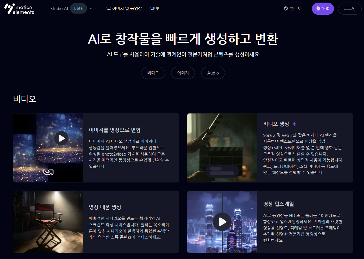 모션엘리먼츠 내에서 직접 고품질 AI 영상을 생성할 수 있습니다.